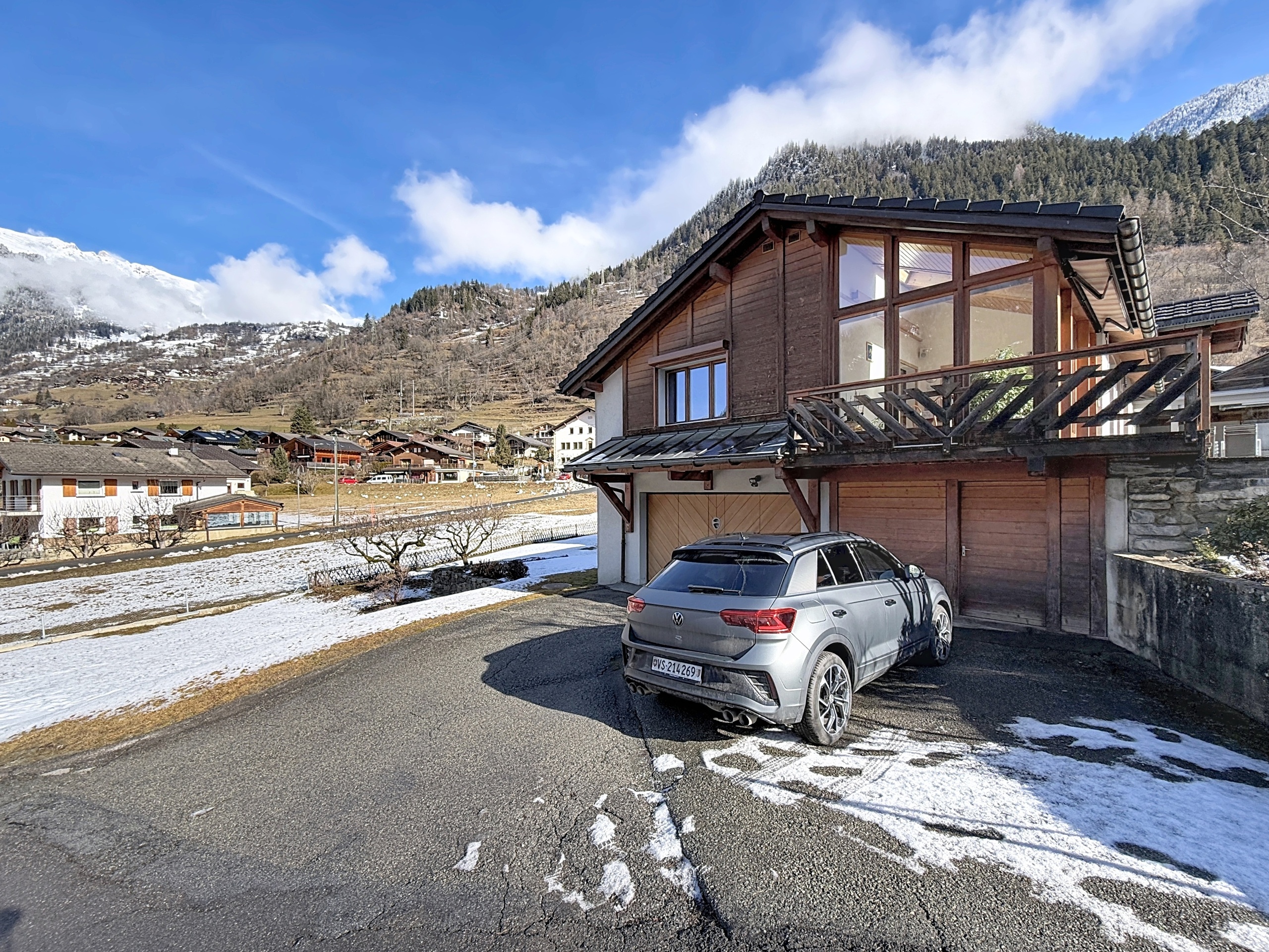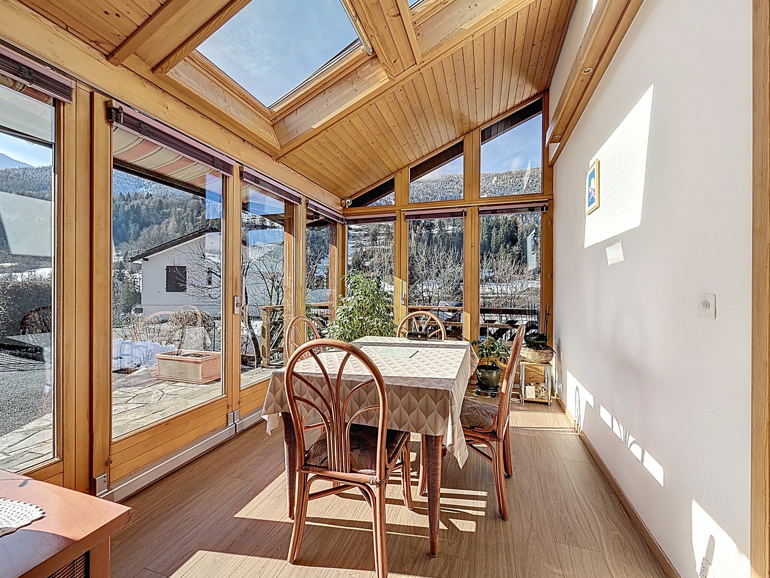 Véranda extérieure, balcons orientés ouest et sud, terrasse dallée : la maison dialogue avec son environnement et capte la belle luminosité alpine tout au long de l'année.
