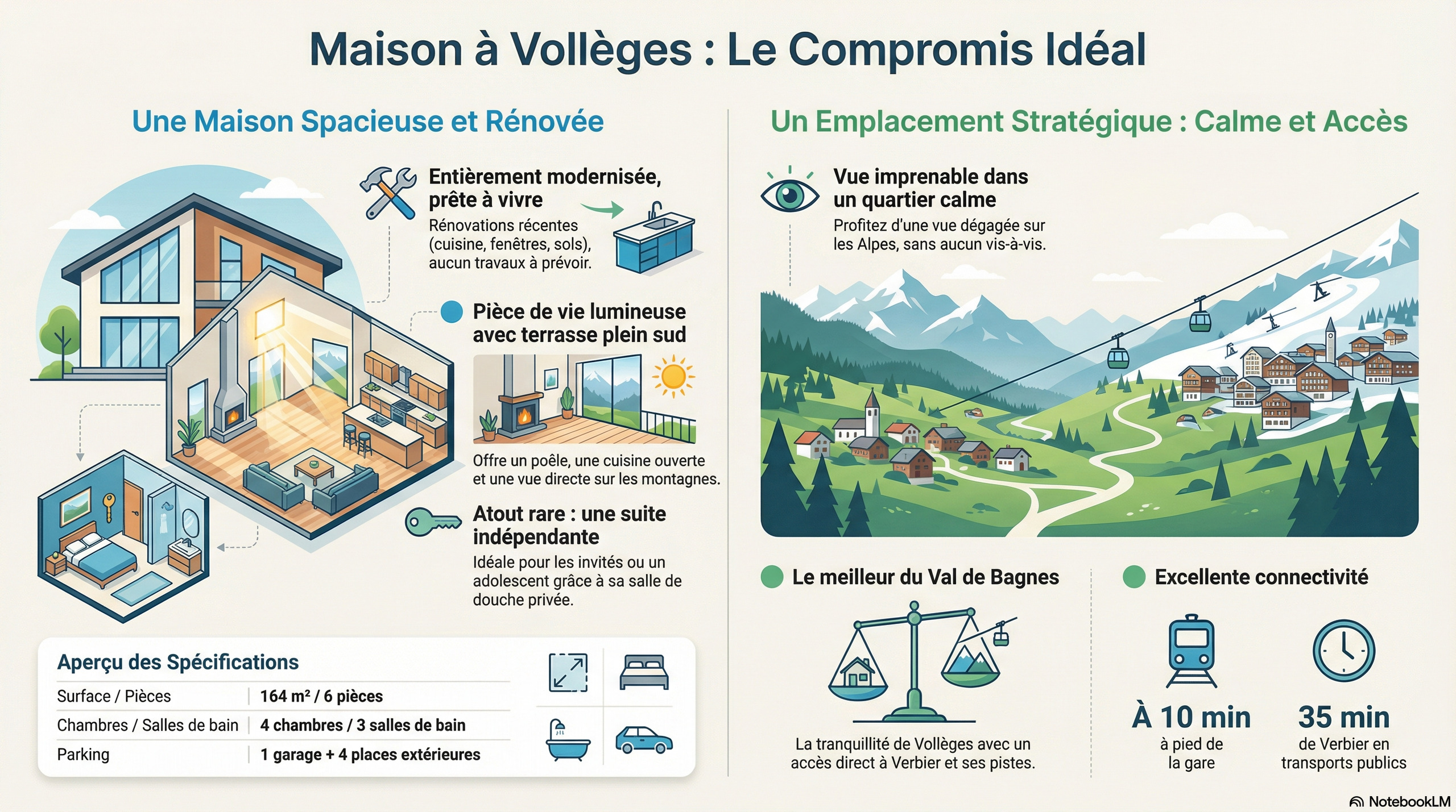 Are you looking for a real change of pace without sacrificing everything? This house in Vollèges offers exactly that balance: absolute calm, unobstructed views over the valley, and yet a 10-minute walk from the train station, 4 minutes from the bus stop, and 35 minutes from Verbier by public transport.